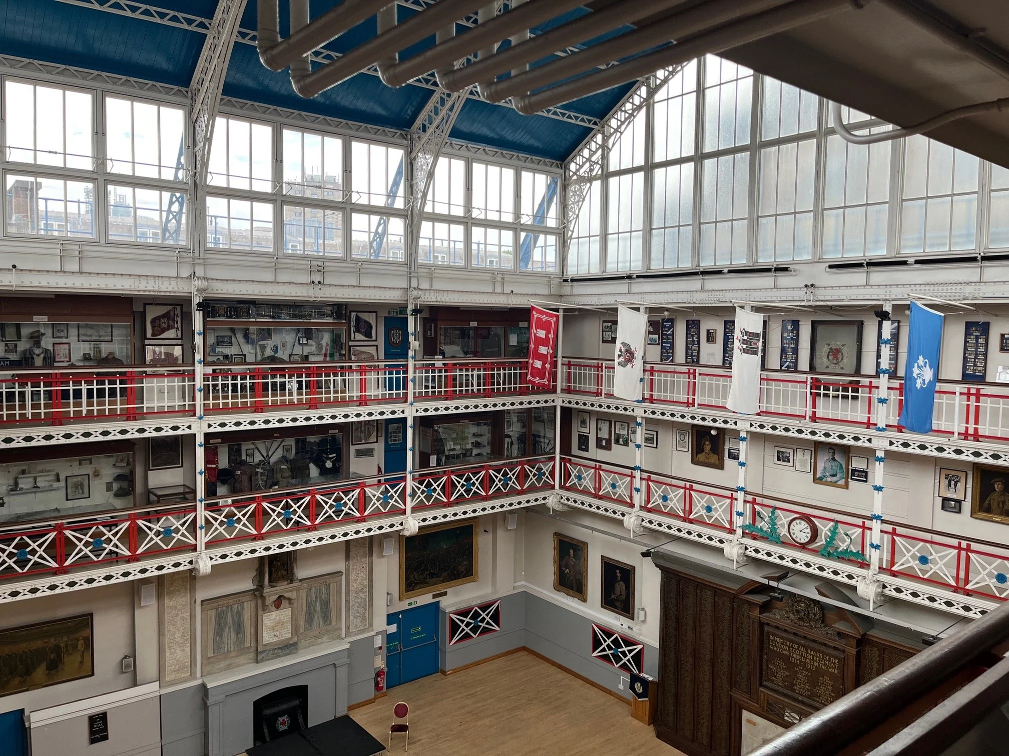The London Scottish Regiment was founded in 1859, drawn from the Scottish diaspora in London. Their historic triple height hall with its restored wrought iron balconies and roofing is open for public visits during the first weekend of the Open House Festival.